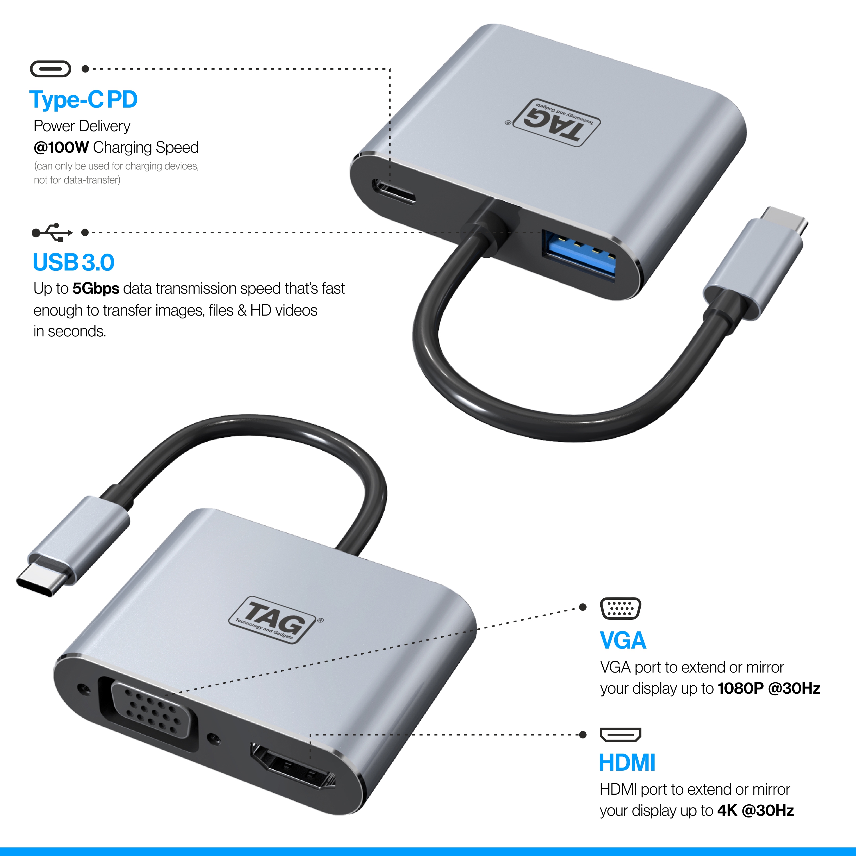 • High-Speed Connectivity: Experience ultra-fast 5Gbps data transfer with the TAG 4-in-1 Type C to Gigabit Ethernet Adapter and 3x USB 3.0 Hub, ideal for streaming, gaming, and large file transfers.